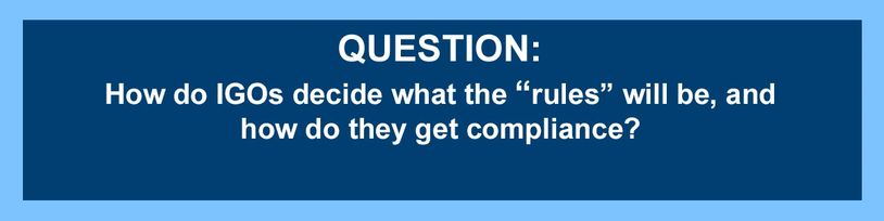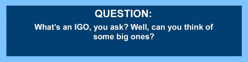 Fortunately, there are a number of Intergovernmental Organizations (IGOs) that help to organize how countries interact each with each other. These IGOs have become increasingly important as the world becomes globalized and international trade proceeds apace. Back in the 1930’s, we didn’t really need any, but today, there are approximately 400 IGOs, each of which consists of a TREATY or CONVENTION that all member countries sign, agreeing to abide by the standards they created by consensus.