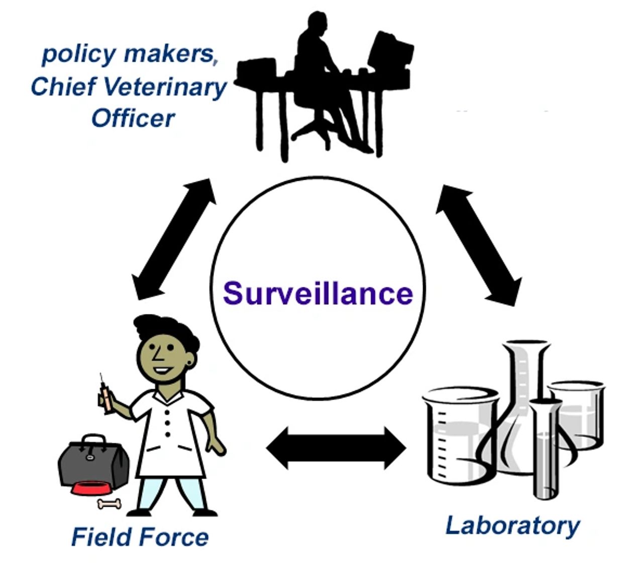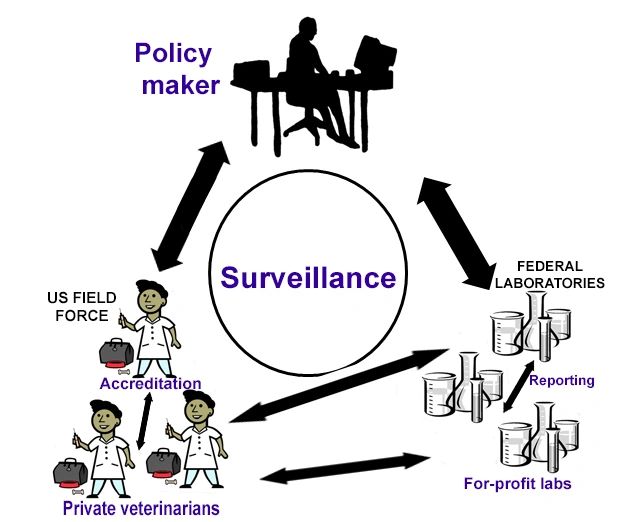 The system consists of government veterinarians (public servants) who are responsible for ensuring the control of the “diseases of the public good”. And, in every country, the VS has three arms, all communicating and working together in an integrated system of surveillance: